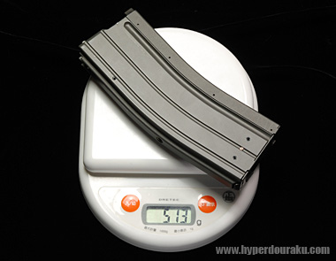 .223Remを30発フル装弾したアルミ製マガジンの重量が約460g程度なので、それよりも重い。6本もったら3Kgを超え、撃っても軽くならないのがちょっと残念。