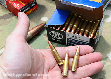 弾も新たに開発された専用の5.7x28mm弾を使用します。拳銃弾とは違う弾頭先端の尖ったボトルネック構造で、ライフル弾をそのまま縮小したような形状となっています。