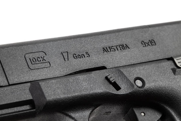 右側面下側の空間にはGlock社の正規ライセンス品であることを示す表記がモールドされており、この部分だけが実銃とは異なっている。