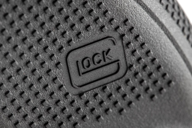 グリップ左側面に入ったGlockロゴのモールドも、ご覧のように完全再現。立体モールドとすることで滑り止めとして機能しているのが心憎いデザインだ。