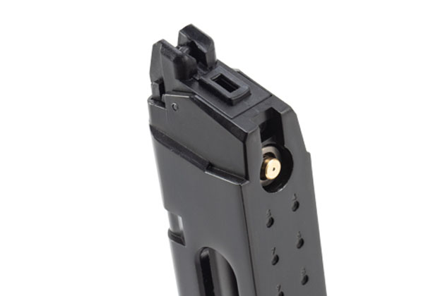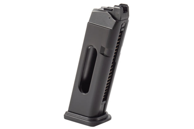 本製品に付属するG17用CO2マガジンは、当然ながら現在流通しているBG-17用CO2マガジンと完全互換で、マガジン本体を構成するパーツはほぼ共通。変わったのはGlockの正式なロゴが入ったマガジンボトムと、形状を見直すことで、マガジンボトムがより確実にロックされるようになったストッパーの2箇所のみだ。