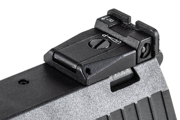 フロントと合わせて高い位置にマウントされた金属製のリアサイトは、実銃同様に上下左右の調整が可能。フロントサイト同様、サイトブレードの背面には反射防止用の細かいグルーブが刻まれている。