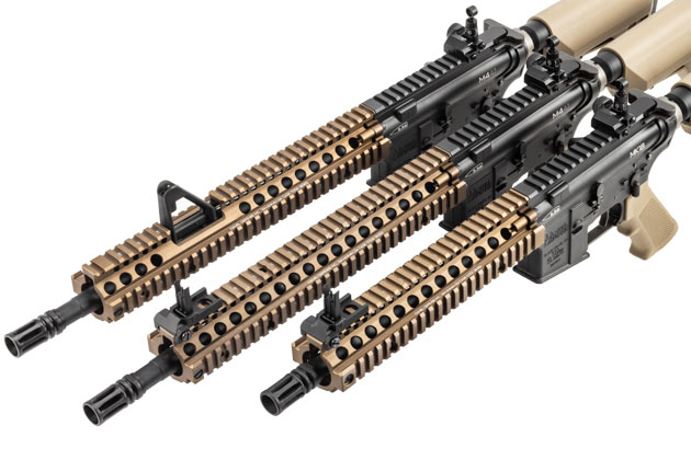 ハンドガードの長さは、M4A1とM4A1FSPが12.5インチ、MK18は9インチとなっている(下段の画像は3機種の写真を合成したもの)。