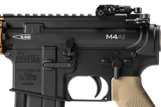 マガジンハウジング側面にはDaniel Defense社のロゴが深々と刻まれ、正規ライセンス品であることを堂々と主張しているが、口径についての表記が「CAL.6MM BB」となっているのは契約上の配慮だろうか。
