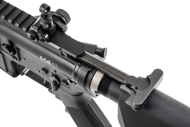 スタンダードタイプのチャージングハンドルを引くと、スチール製のポートカバーが開き、長大なエジェクションポートからロッキングラグを含めたボルトフェイスとチャンバー内部を覗くことが出来る。GBBモデルならではのリアルな光景だ。
