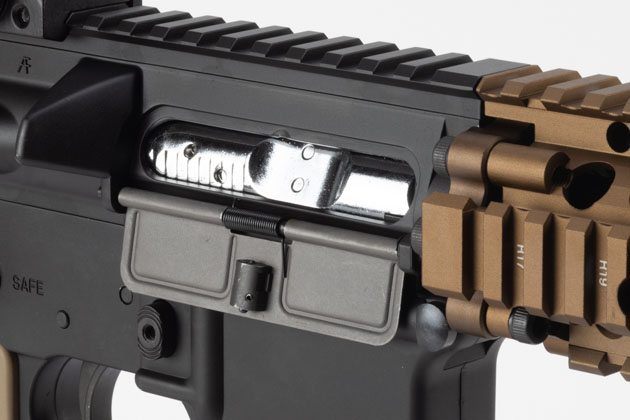 尚、重量のあるボルトキャリアグループを受け止めるボルトキャッチレバーは、耐久性に優れたスチール製となっている。