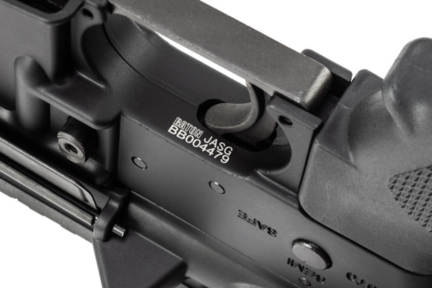 トリガーガード部分を下から覗くと、BATONのロゴに加え、JASG認定ガスガンの証であるシリアルナンバーが白く刻印されている。