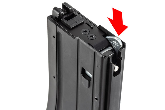尚、注入したガスを使い切った(ガスが空になった)状態のマガジンに再度ガスを注入する場合は、画像中赤い矢印で指したバルブロック解除レバーを軽く押し込んでから作業する必要がある点にも注意したい。