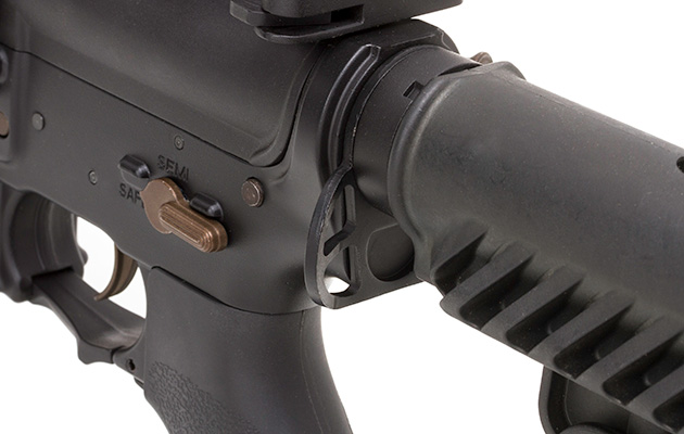 M4CQB SPORT LINEでは一体成型のモールドだった、フレーム左側面のボルトリリースレバーは今回別バーツ化。レバーを起こした状態でチャージングハンドルを引くと、ボルトカバーが後退した状態でロックされる機能が追加された。ロックされたボルトカバーは、リリースレバーを押し込めば解除されるが、実銃同様にチャージングハンドルを引くことでも解除出来る。性能には関係ないが、ガンマニアとしては実に嬉しいポイントだ。