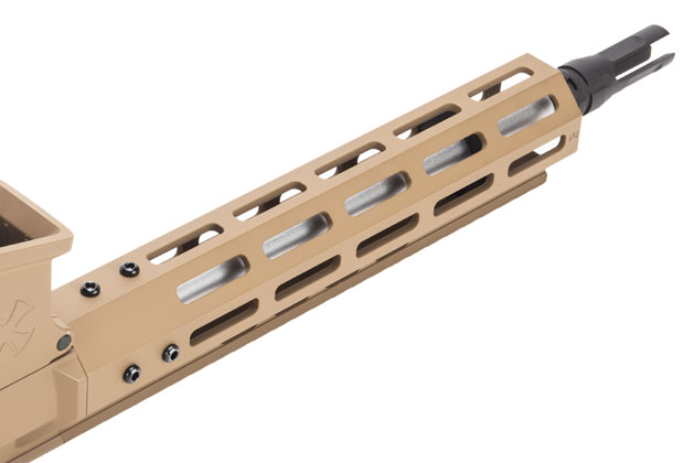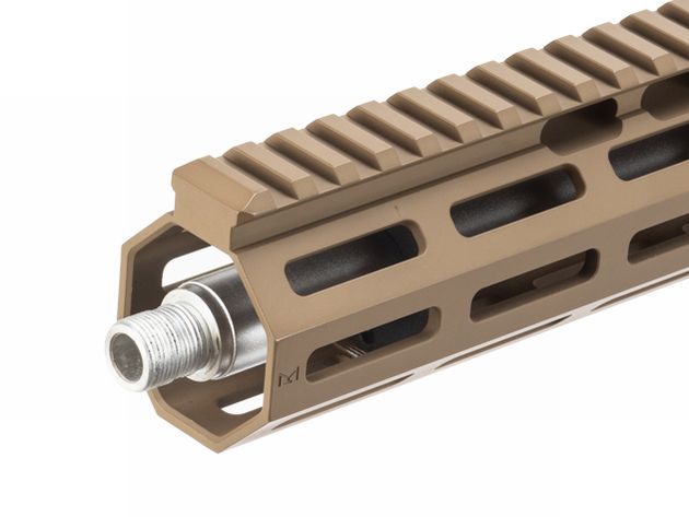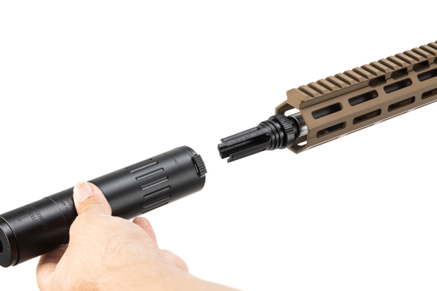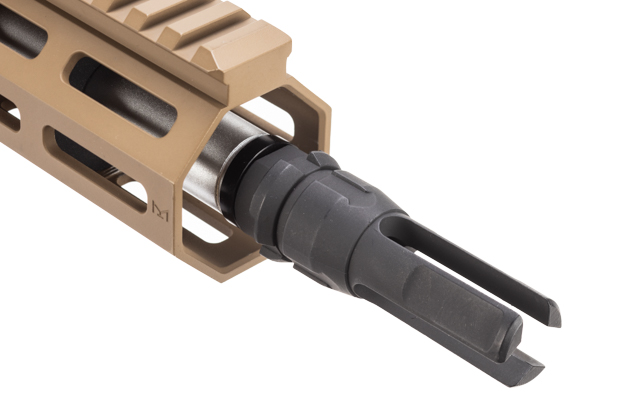 10.5インチのアウターバレル先端には、実銃が採用しているDEAD AIR社のKeyMountフラッシュハイダーを模したシャープなスリープロングタイプハイダーを装備。アウターバレル先端は14mm逆ネジ仕様のスレッドになっているので、ハイダーを取り外すことで好みのマズルデバイスの装着が可能だ。