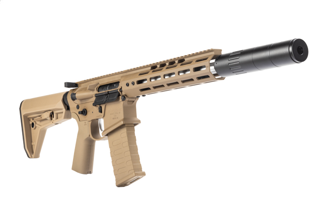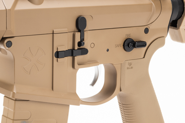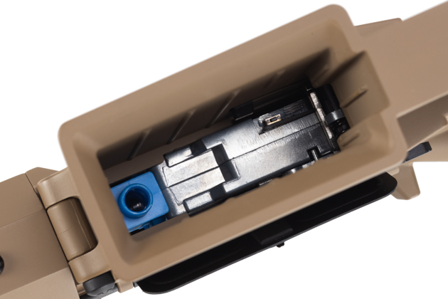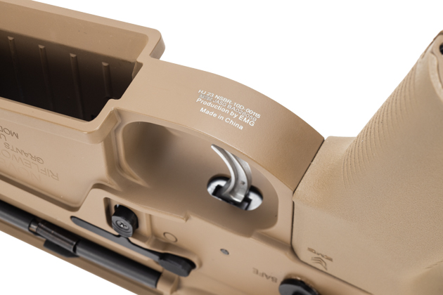 レシーバー右側面にはアンビ仕様のやや短いセレクターレバーに加え、同じくアンビ仕様のボルトリリースがマガジンリリースボタンの上に設けられている。ボルトストップがかかった状態でのマガジンチェンジにおいて、左手でフレッシュマガジンを挿入した直後にトリガーフィンガーでボルトをリリース出来れば、次弾発射が格段に速くなることは、M4系ARユーザーならイメージ出来ることだろう。