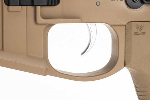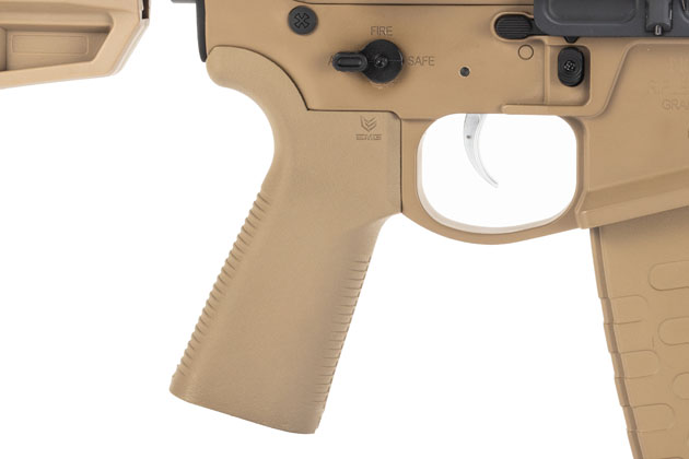 ハイトルクモーターを内蔵した樹脂製グリップはEMG (Evike Manufacturing Group)のロゴが入ったオリジナルだが、近年のトレンドである角度の立ったデザインを採用しており、脇を締めたコンパクトな構えが可能だ。