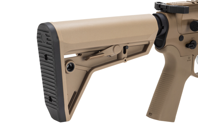 バットストックはMOE-SLカービンストックを模したスリムな物で、左右両側に設けられたリリースレバーとQDスイベルマウントはもちろんのこと、チェストリグやプレートキャリアの装着時にフィットするよう角度の付いたバットプレート等、実物同様の使い易さを再現。無論、6段階のポジション調整も行える。