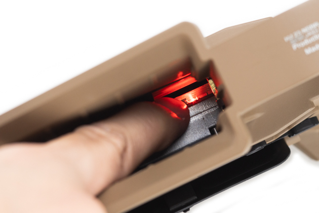 スイッチはごく小さい物だが、指先で容易に操作可能で、モードの変更に当たって特別な設定等は一切不要。具体的にはスイッチを押し込むことで点灯する赤いLEDランプが2~3秒で点滅し、モードが切り替わったことを知らせる手軽な仕組みだ。尚、マガジンの挿入でスイッチが誤作動する心配は無い。