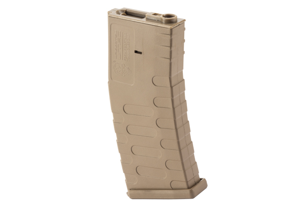 付属のマガジンは装弾数300発の多弾タイプ。内蔵されたゼンマイが強力なため、およそ20発毎秒のフルオートサイクルに難なく対応し、レーザービームのような弾道を実現してくれる。