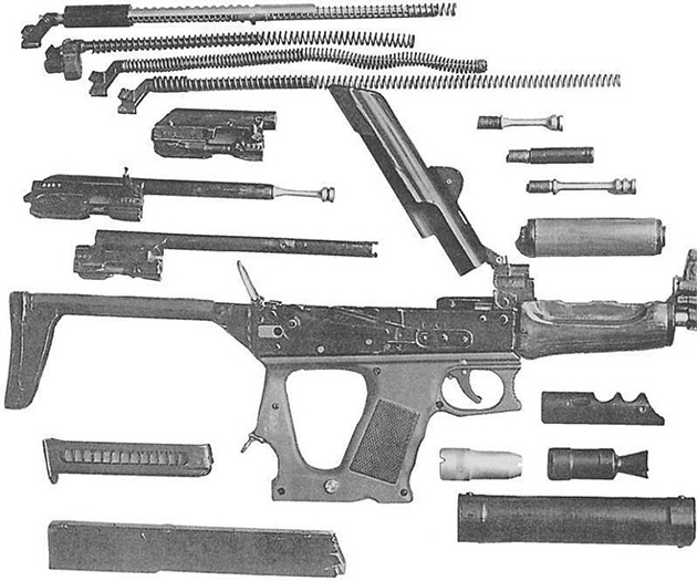 クリンコフとして知られているAKS-74UとMAGPUL FPGを合体させたような見た目のこの短機関銃。初めてメディアに登場したのはソ連崩壊後の1997年のことでした(開発はロシアの銃器製造会社の一つであったレクス社が1995年から行っていたそうです)。