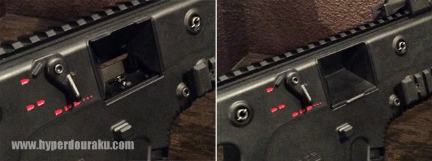 可変ホップアップのダイヤルには数字が刻まれています。このエジェクションポートにはダストカバーがついていて、実銃ももともとの設計では砂漠戦を想定してダストカバーを装備する計画があったそうです。実銃のようにカートが排出されるわけではないので、このカバーはあったほうが嬉しい機能だと思います。