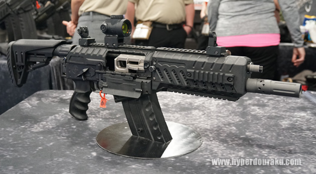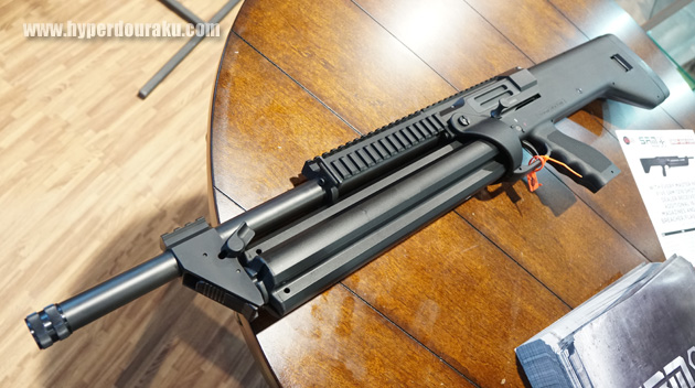 このSRM 1216ショットガンは4連チューブマガジンに各4発入って手で回しながら撃つセミオートショットガン。