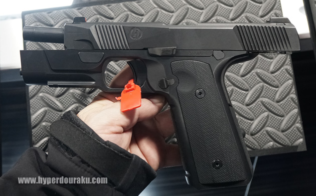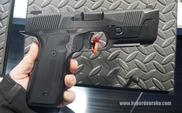 HUDSONのH9。1911ライクな雰囲気を持ちつつも独特の先進的なデザイン。リコイルスプリングユニ。ットがトリガーガードの前に格納される。