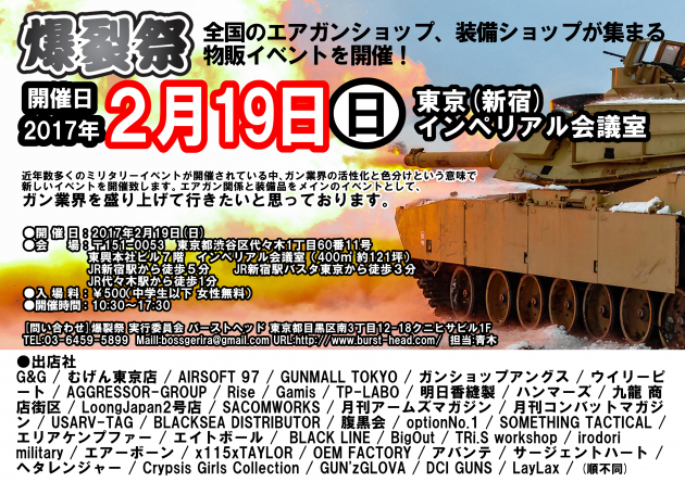 バーストヘッド主催のエアガン関係と装備品をメインの新しいミリタリーイベントが2月19日(日)に新宿で開催されます。