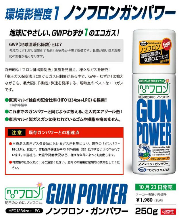 東京マルイが10/6に「ノンフロン・ガンパワー」という新ガスを発表しました。