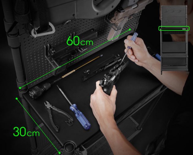 製品全体はハンドガンや装備を引き立てるダークグレーですが、天板と引き出し部分のみ、パーツや工具を目立たせ、汚れが目立ちにくい黒色を採用しました。