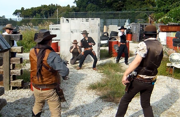 決闘はモデルガン同士かエアーガン同士で撃ち合います。