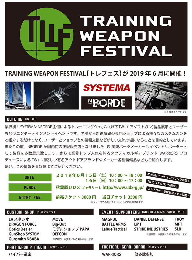 業界初!SYSTEMA・NBORDE主催によるトレーニングウェポン(以下TW:エアソフトガン)製品展示とユーザー参加型エンターテインメントイベントです。老舗から新進気鋭の専門ショップによる様々なカスタムガンをご紹介するだけでなく、ユーザーとショップとの情報交換など新しい交流の場になることを目的としています。