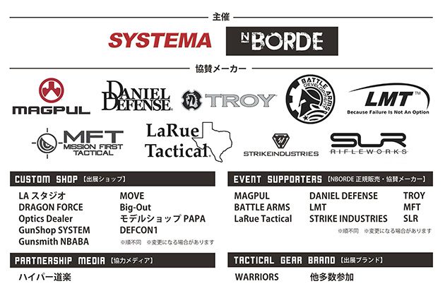 またこの度、NBORDE が国内初の正規販売店となりましたUS 実銃パーツメーカーもイベントサポーターとして製品を多数展示致します。さらに業界トップ人気を誇るタクティカルギアブランドWARRIORS プロデュースによるTW に相応しい有名アウトドアブランドやメーカー各種装備品などもご紹介します。