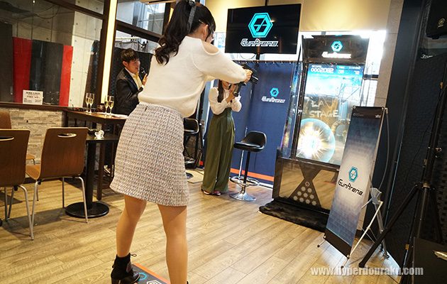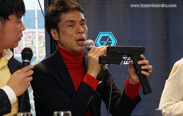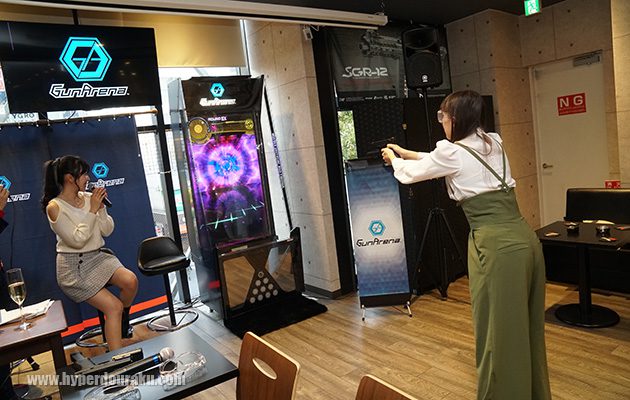 先行稼働に先立って、2018年12月10日に秋葉原のシューティングカフェ&バー「アキバベース」にて開催されたメディア内覧会では、ゲストに望月茉莉、あいしすを迎え、開発を担当したナツメアタリ社のGunArenaプロデューサーである内 剛氏による説明が行われた。