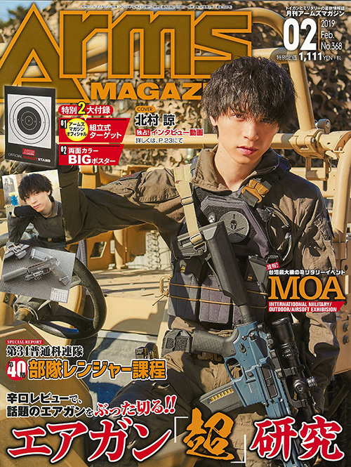 それでは、11月27日に発売されます2019年2月号をご紹介させていただきます。今月号の表紙は本誌連載記事『LEAD』や、2018年10月に開催されましたサバゲ祭でもゲスト参加していただいた北村諒さん。実は、男性タレント単体がアームズマガジンの表紙を飾るのは実に十数年ぶり。2003年2月号から判型がA4ワイド判になってからは初めてです。グラビアと連載記事、さらにロングインタビューを組み合わせた特別編で、サバイバルゲーマーの北村諒さんの魅力をお届けします。