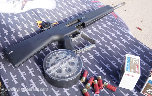 なんと、Sol Invictus ArmsではフルオートショットガンのAA-12が撃てました!! スレッジハンマー刻印のボックスマガジンとドラムマガジンでバリバリフルオート射撃してみました。ものすごい反動ですが、撃ち始めてしまえば意外と銃を抑え込むことができました。