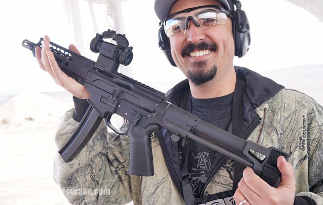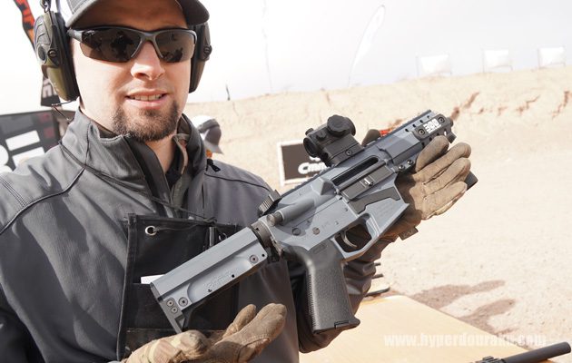 CMMGのMK57というピストルキャリバーカービン(PCC)です。モデル名にもあるようにFN Five-seveNのマガジンを使用できる5.7mm x 28弾を使用するPCCです。ものすごく撃ちやすかったですね。