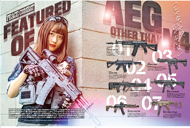 それでは、今号の1特です。今号はFEATURED OF AEG OTHER THAN M4 と称しまして、M4以外の電動ガンだけで特集を組んでみました。最近発売されたM4以外の電動ガンで、「なれなりに知名度がある」「現代のモデル」で「カスタマイズの幅が広く」そして「かっこいい」電動ガンを、編集部が独自偏見でピックアップ&カスタム! サバゲでバリバリ使える、とにかくかっこいい銃が勢揃いの特集になってます。