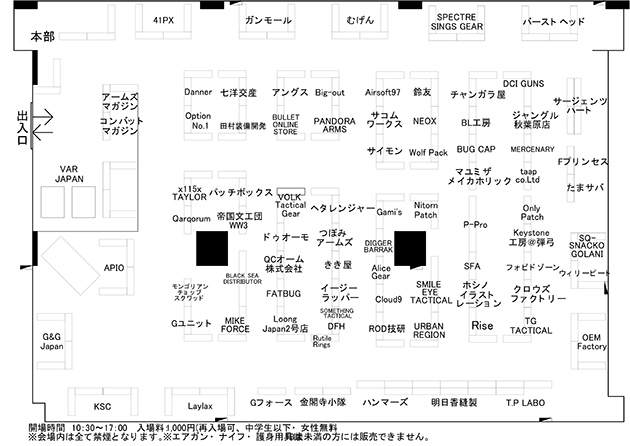 G&G JAPAN/LayLax/KSC/VAR LIVE JAPAN/DANNER/ガンショップアングス /AIRSOFT 97/ウイリーピート/むげん東京店/GUNMALL TOKYO/明日香縫製/ハンマーズ/Rise/T.P.LABO /サイモン/SQ-SNACKO GOLANI/Wolf Pack/SPECTRE SIGNS GEAR/鈴友/田村装備開発/MIKE FORCE/SMILE-EYE TACTICAL/PANDORA ARMS/Loong Japan 2号店/チャンガラ屋/VOLK TACTICAL GEAR/URBAN REGION/サージェンツハート/TG-TACTICAL/Gamis/BigOut/AliceGear/41PX/patchbox/F.PRINCESS/サコムワークス/ジーフォース/ドゥオーモ/only patch/つぼみアームズ/MERCENARY/FATBUG/BLACK SEA DISTRIBUTOR/きき屋/BL工房/Qaraqorum/ホシノイラストレーション/イージーラッパー/BURST-HEAD/DCI GUNS/マユボ・ザ・メイカホリック/Nitron Patch/x115x TAYLOR/Gユニット/BULLET ONLINE STORE/ジャングル秋葉原店/taap/CROW’S factory/フォビドンゾーン/金閣寺小隊/ROD技研?/Cloud9/OEM factory/七洋交産/TAKE ON/Option No,1/ヘタレンジャー/帝国文工団WW3/BUG CAP/NEOX/QCオーム株式会社/モンゴリアンチョップスクワッド/たまサバ/DIGGER BARRRAK/SFA/コンバットマガジン/アームズマガジン車両展示/APIOMC/戦え!!ぴっちょりーな☆