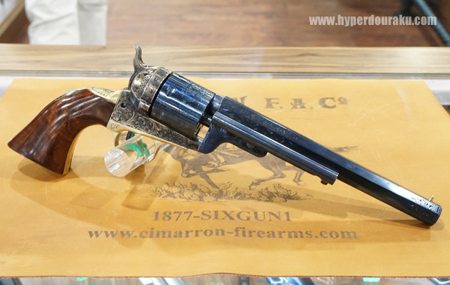 ウエスタンな銃器メーカーも多くて、ついつい見入ってしまいます。このCimarron Firearmsのエングレープリボルバーも素敵。