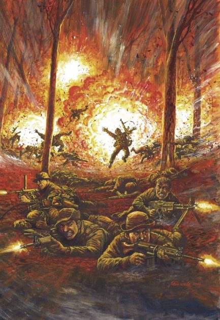 タイトルでもあるデンジャー・クロース(味方にも砲撃が届くほどの超至近距離への着弾)をイメージした迫力満点のイラストを描いた上田さんは「最近の戦争映画は考証が正確で、この作品もオーストラリア軍の軍装・兵器は完璧です。米空軍の支援も少なく、クレイモア地雷が無い部隊は、砲兵隊の援護射撃を頼りにNVAの猛攻撃に堪えるリアルな射撃戦闘映画です」と、細部までこだわり抜かれた戦争描写を絶賛。