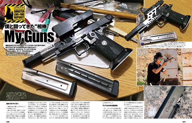 - シャークシューターこと鮫島宗貴氏の渡米10周年企画として、今まで購入し、共に試合に挑んできた相棒=愛銃を一挙紹介! 始めて購入したレースガンから現在使用中のモデルまで、深い思い入れとエピソードをたっぷりと語ってもらった。また、アメリカの中古銃事情や中古銃の見極め方など、米国在住の鮫島氏ならではの情報も満載。常に挑戦を続ける男の熱い思いをぜひ感じてほしい!