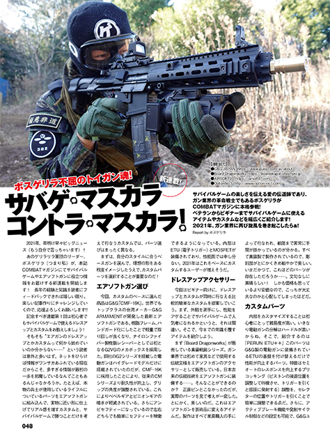 ●某サバイバルゲーム雑誌で誕生し、今やミリタリー業界で知らぬ者はいないとまでいわれるあのボスゲリラがなんとCOMBATマガジンに本格参戦! サバイバルゲームの楽しさを伝える愛の伝道師であり、ガン業界の革命戦士でもあるボスゲリラがベテランからビギナーまでサバイバルゲームに使えるアイテムやカスタムなどを幅広くご紹介! 2021年、ガン業界に再び旋風を巻き起こす新連載を見逃すことなかれ!