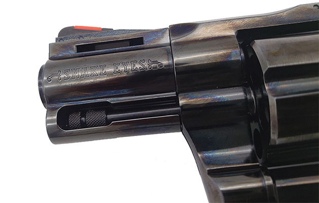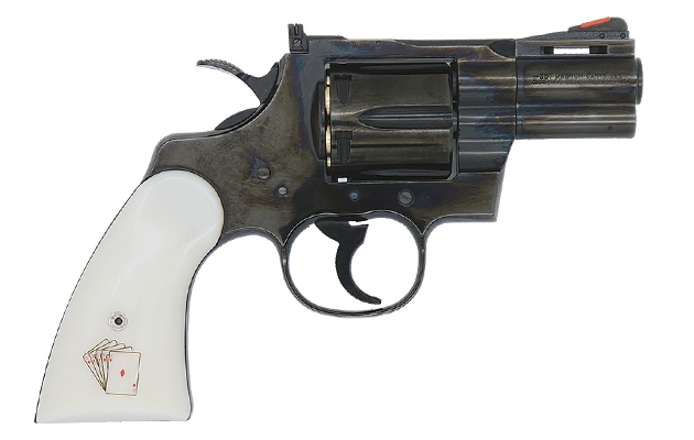 1989年にコルト社で生産された希少で有名な限定モデルです。色違いの2丁と、カジノをイメージした照明付きの木箱が付属し、500セット限定で販売されました。レッドランプ入りの2.5インチのバレルには「snakeeyes」の刻印が入り、フレームボトムにはシリアルナンバーが刻印されています。