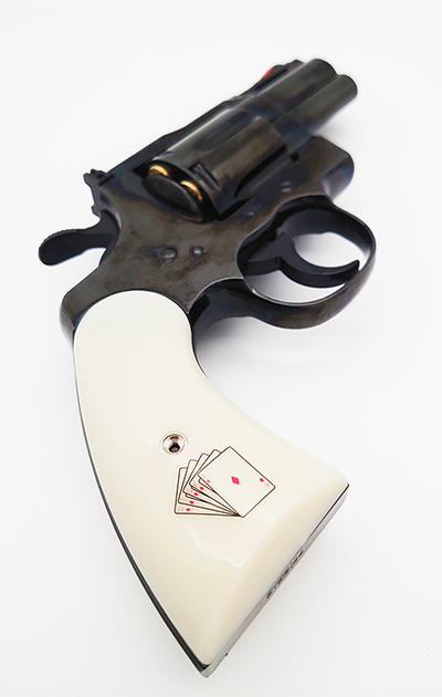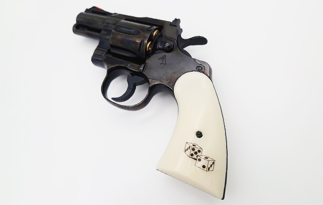 専用のアイボリーグリップにはすべてのポーカーハンドの中で最強のロイヤルフラッシュと、「蛇の眼」に睨まれ降伏するしかない状態をイメージさせるサイコロのゾロ目が描かれています。このスネーク・アイズのブラックモデルをモデルガンで再現しました。