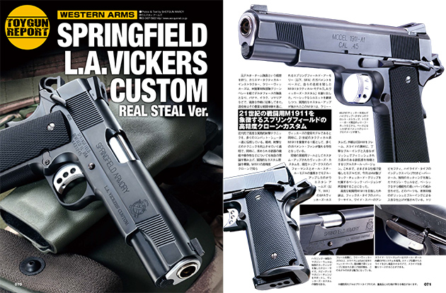 - 元デルタ・チーム隊員という経歴を持つ、カリスマ・タクティカル・インストラクター、ラリー・ヴィッカーズ。氏がその豊富な戦闘体験を基に、実践的なカスタム理論を構築し作り出したのが、自らの名前を冠したM1911タクティカル・モデル、L.A.ヴィッカーズ・カスタムだ。今月はそれを正確に再現したウエスタンアームズの「SFA L.A.ヴィッカーズ・カスタム/リアルスチール・バージョン」を徹底リポート。M1911らしい逞しさと、オール・スチール・モデルの重厚なムードを楽しむコレクションとしてはもちろん、最新のバージョン3メカにプル・バックシステムのスライド・リリースレバーを採用した高度な実射モデルでもある、まさに才色兼備の1挺!
