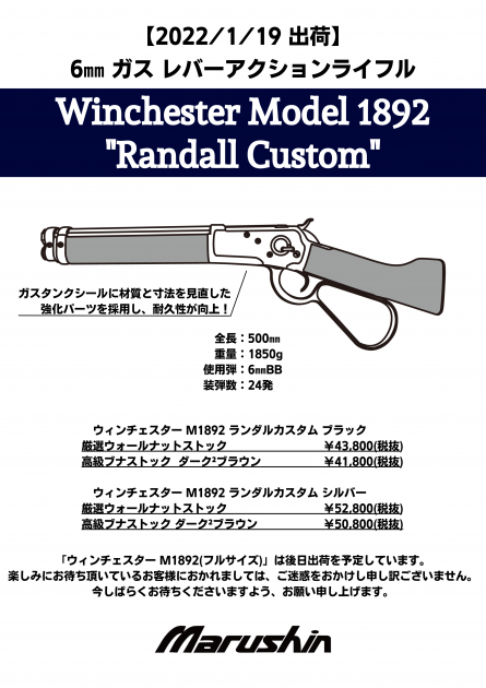 マルシン工業からランダルカスタムが本日出荷 2022.01.19 ガスガン マルシン工業の6mmガスガン、ランダルカスタムが2022年1月19日に出荷されました。 ウィンチェスター M1892をベースとしたソードオフモデル「ランダルカスタム」 映画『拳銃無宿』で主人公のジョッシュ・ランダル(スティーブ・マックイーン)が使用したことがその名前の由来となっています。 カラーはブラックとシルバー、ウォールナットとブナ材を使用した2タイプがあります。 写真提供:マルシン工業 関連リンク2021年5月7日 KSC P230JP(HW)が再生産2012年7月11日 カプコンサマージャムでゾンビシュート!!2016年4月28日 静岡ホビーショー、東京マルイからのメッセージを解く!2022年1月31日 S&Wとコルトが合体! タナカからスモルトリボルバー発売