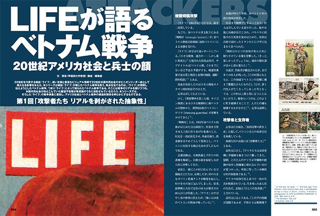 ●鋭い舌鋒と豊富なビジュアル情報で20世紀米国市民社会のオピニオンリーダー誌として絶大なる影響を与えた20世紀を代表する雑誌『ライフ』。今月号から始まる早稲田大学教授・原 克氏による本シリーズは、雑誌『ライフ』が報じたベトナム戦争、つまり『ライフ』によって語られたベトナム戦争に焦点を当て、アメリカ社会とベトナム戦争の構造的関係を明らかにする。今まで見えてこなかった米国市民社会が抱え込んできた願望や苦難を読み解く総力特集。