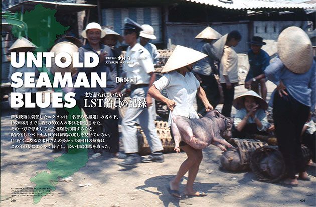 ●ベトナム戦争時、南ベトナムの各地に大規模な基地を展開した米軍に様々な物資を輸送した兵站揚陸艦LST。新大統領に就任したニクソンは「名誉ある撤退」の名の下、1969年8月までに約2万5000人の米兵を撤退させた。その一方で停止していた北爆を再開するなど、泥沼化したベトナム戦争は終結の兆しを見せていない。1年近くに及んだ木村さんの長かった5回目の航海はこの年の夏にようやく終了し、長い有給休暇を取ったーー。今日まで人目に触れることなく眠っていた写真と、語られることのなかったLST乗組員の記憶が今誌面で明らかになる好評企画第14回。
