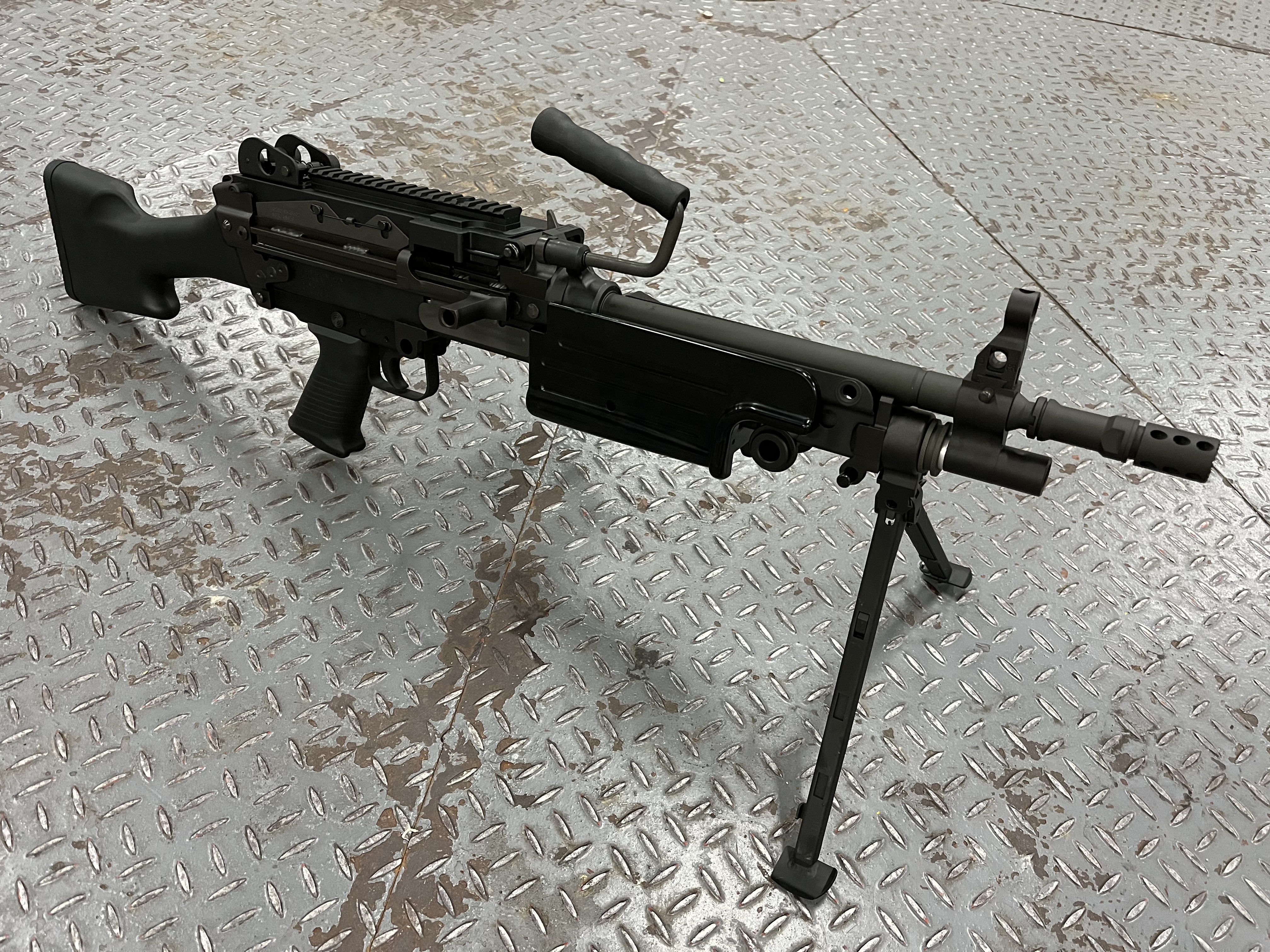 箱を開けて手にした瞬間、まず銃本体の軽さに驚きました。各部にアルミパーツを多用することでメーカー公称値で3,640gを実現しておりアサルトライフル並みの重量です。ショートバレルとあいまって取り回しやすいです。剛性もしっかり確保されておりガタツキなどは一切ないです。FNとの正式契約によりディテールだけではなく至るところに施されているシリアルナンバーが忠実に再現されており、リアル派も納得の出来映えです。