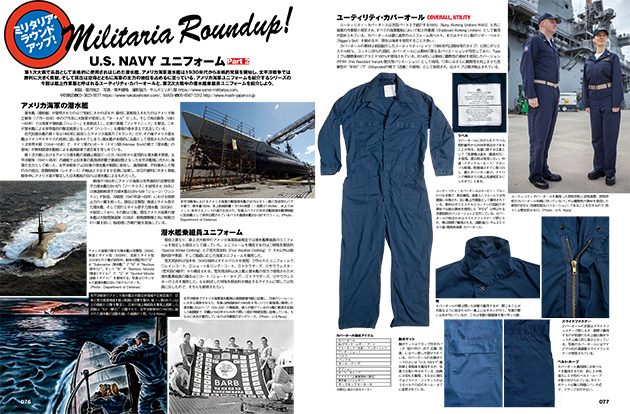 第1次大戦で兵器として本格的に使用されはじめた潜水艦。アメリカ海軍潜水艦は1930年代から本格的発展を開始し、太平洋戦争では勝利にお菊貢献。そして現在は空母とともに海軍の主力の地位を占めるに至っている。アメリカ海軍ユニフォームを紹介するシリーズ。今回は艦上作業服と呼ばれるユーティリティ・カバーオールと、第2次大戦中の潜水艦乗組員ユニフォームを紹介。貴重な写真も掲載した資料性の高いシリーズ連載第2弾!
