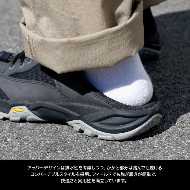 アッパーデザインは排水性を考慮しつつ、かかと部分は踏んでも履けるコンバーチブルスタイルを採用。フィールドでも脱ぎ履きが簡単で、快適さと実用性を両立しています。
