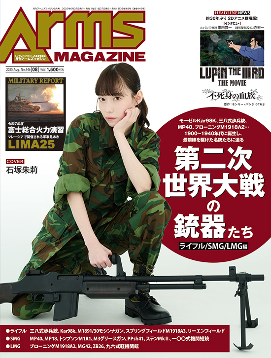 それでは、6月27日発売の2025年8月号をご紹介させていただきます。今月のカバーガールは女性アイドルグループ「NMB48」に2011年に加入して約10年間活動してきた石塚朱莉さん。現在はゲーム実況のYouTubeで活躍している彼女らしく、FPSゲームなどでよく登場する第二次世界大戦、ベトナム戦争当時をイメージしたコスチュームに身を包んだもらいました。分隊支援火器の元祖ともいえるブローニングM1918A2からトンプソンM1A1、M3A1グリースガンまで大小問わずいろいろな銃をカッコよく構えてくれました。