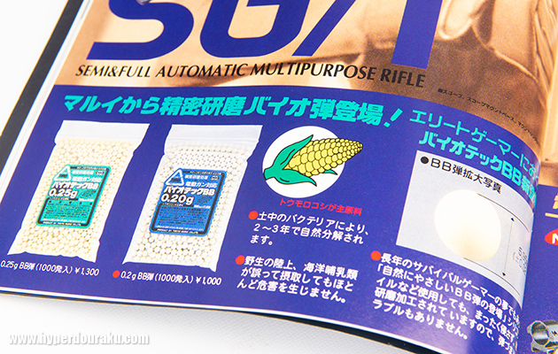 当時は商業フィールドはほとんどなく、多くが河川敷や山林でゲームがおこなわれていた。そうなると野外でプラスチック弾をバラまくサバゲーに対して、世間や地主からの風当たりが強くなってくる。サバゲーやエアガンの普及拡大策として環境にも配慮しているというジェスチャーが求められ、「自然に還る」「環境に優しい」といったバイオBB弾のニーズが高まったということだろう。